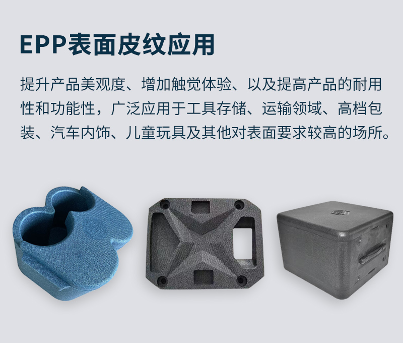 EPP表麵皮紋技術可以賦予EPP製品(pǐn)更加細膩(nì)和高檔的外觀質感。通過在EPP表麵(miàn)形成紋理或圖案,可以使其(qí)看起來(lái)更加精致,並(bìng)增加產品的吸引力和(hé)附加值。