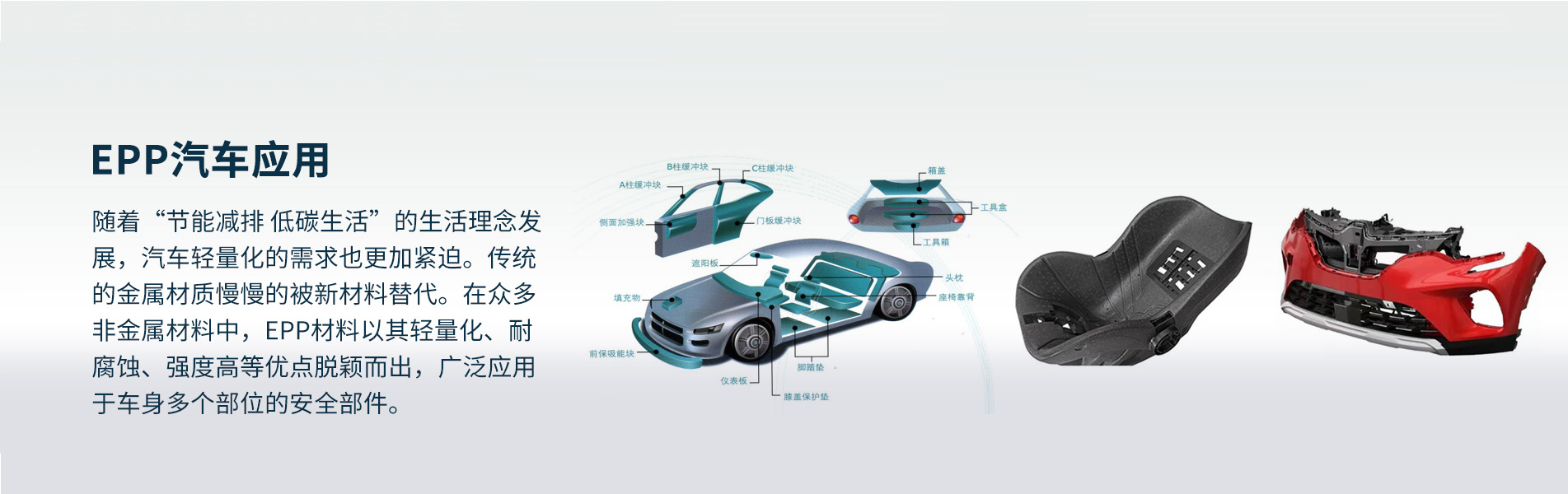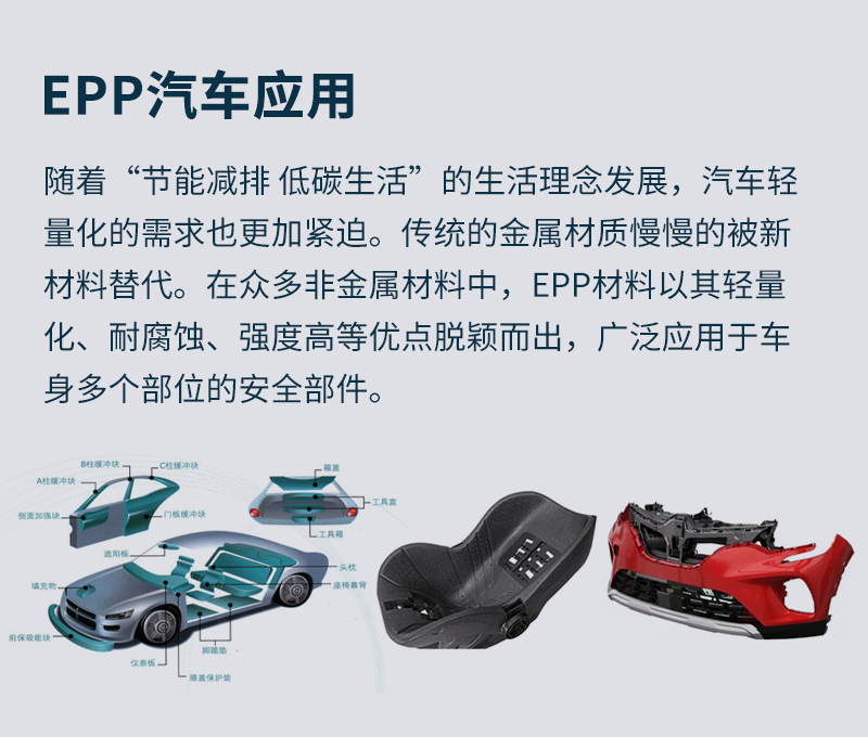 EPP材料的輕質特性使其成為汽車製造領域的理想選擇。在(zài)汽車構(gòu)件中使用EPP可以降低車身重量,提高燃油效率,並減少碳排放量,有助於實現(xiàn)更環保的交通運輸。